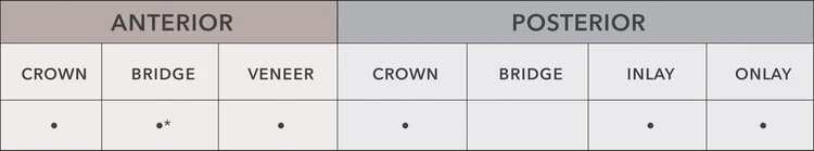 *We do offer e.max anterior bridges, however they are not warrantied by the lab.