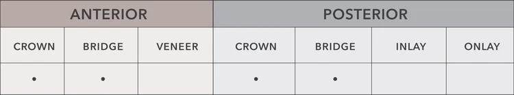 Porcelain fused to metal can be used for single and posterior single-unit crowns and bridges, and can be designed to fit any type of preparation as well. PFM restorations are also indicated for crowns and bridges used in combination with cast partials. Porcelain can be fused to non-precious, semi-precious or white high noble copings.